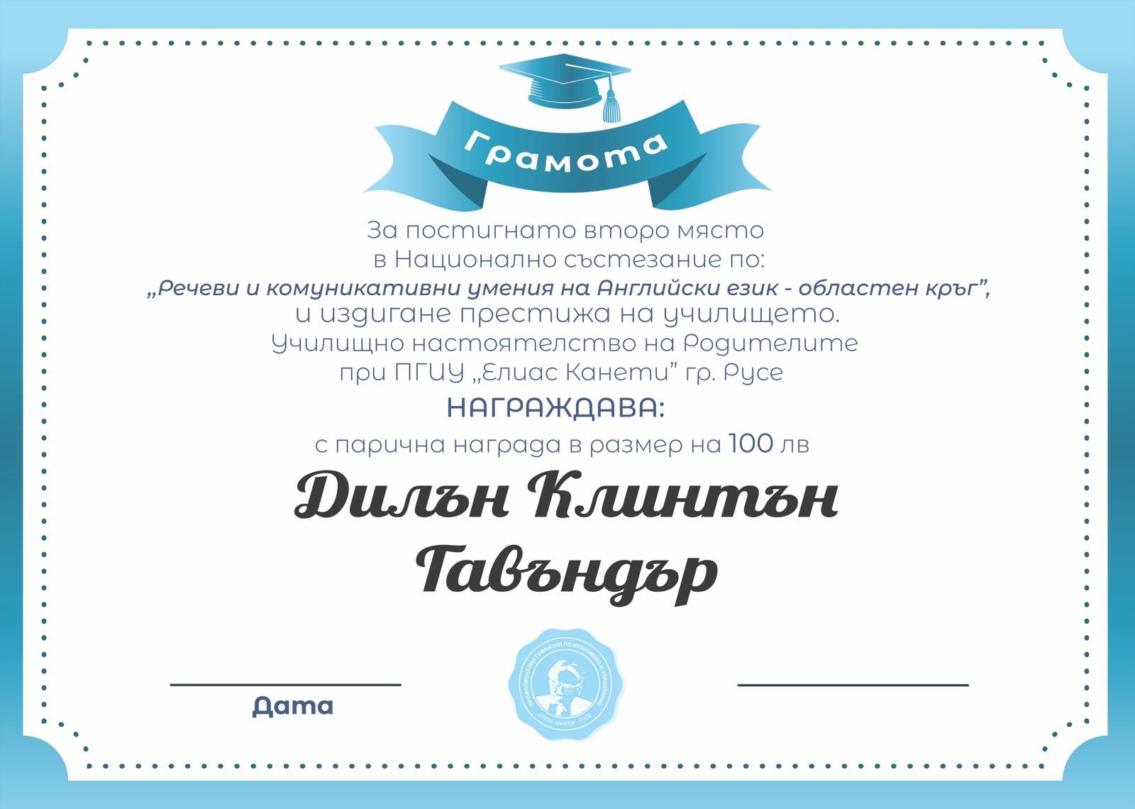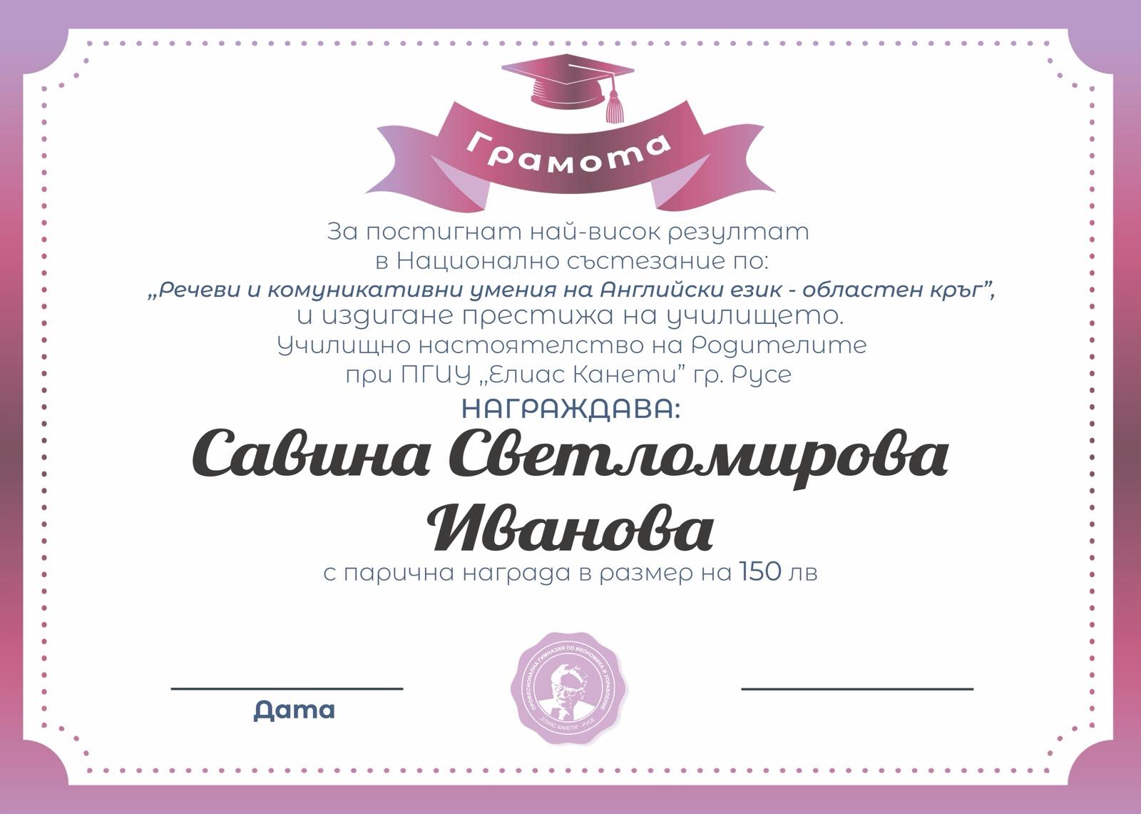 Горди сме да съобщим, че Савина Иванова, ученичка от XI клас, и Дилън Гавъднър, ученик от VIII клас на ПГИУ „Елиас Канети“, постигнаха изключителен успех, като завоюваха първо и второ място на областния кръг на ,,Национално състезание за речеви и комуникативни умения по английски език”.