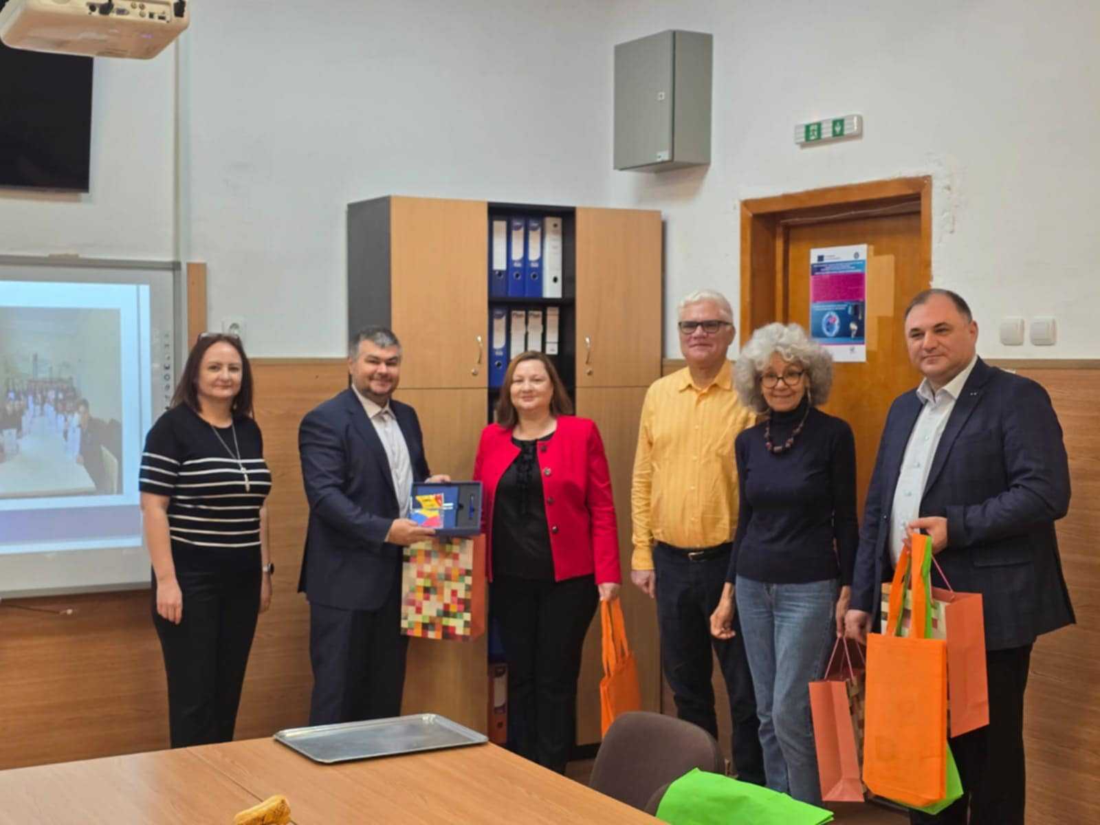 В рамките на посещението се обсъдиха възможностите за съвместни проекти по програма ERASMUS +, съвместни инициативи между възпитаниците и преподавателите на двете учебни заведения. Разгледана бе обновената сграда на гимназията, както и посетени партньорски икономически агенти, където учениците провеждат стажове. „Теоретична гимназия „Йон Барбу“ води началото си от 1960г. Носи името на поета и математика – Дан Барбилян – Йон Барбу. Предлаганите специалности са в областта на икономиката, услугите, търговията, туризма и хранително-вкусовата промишленост. Преподавателският екип е от 100 учители, ученици – 927. Гимназията разполага със специализирани кабинети и лаборатории. БЛАГОДАРИМ на домакините за топлото посрещане! Срещата е в духа на един от приоритетите в дейността на Еврорегион Данубиус – сферата на образованието.