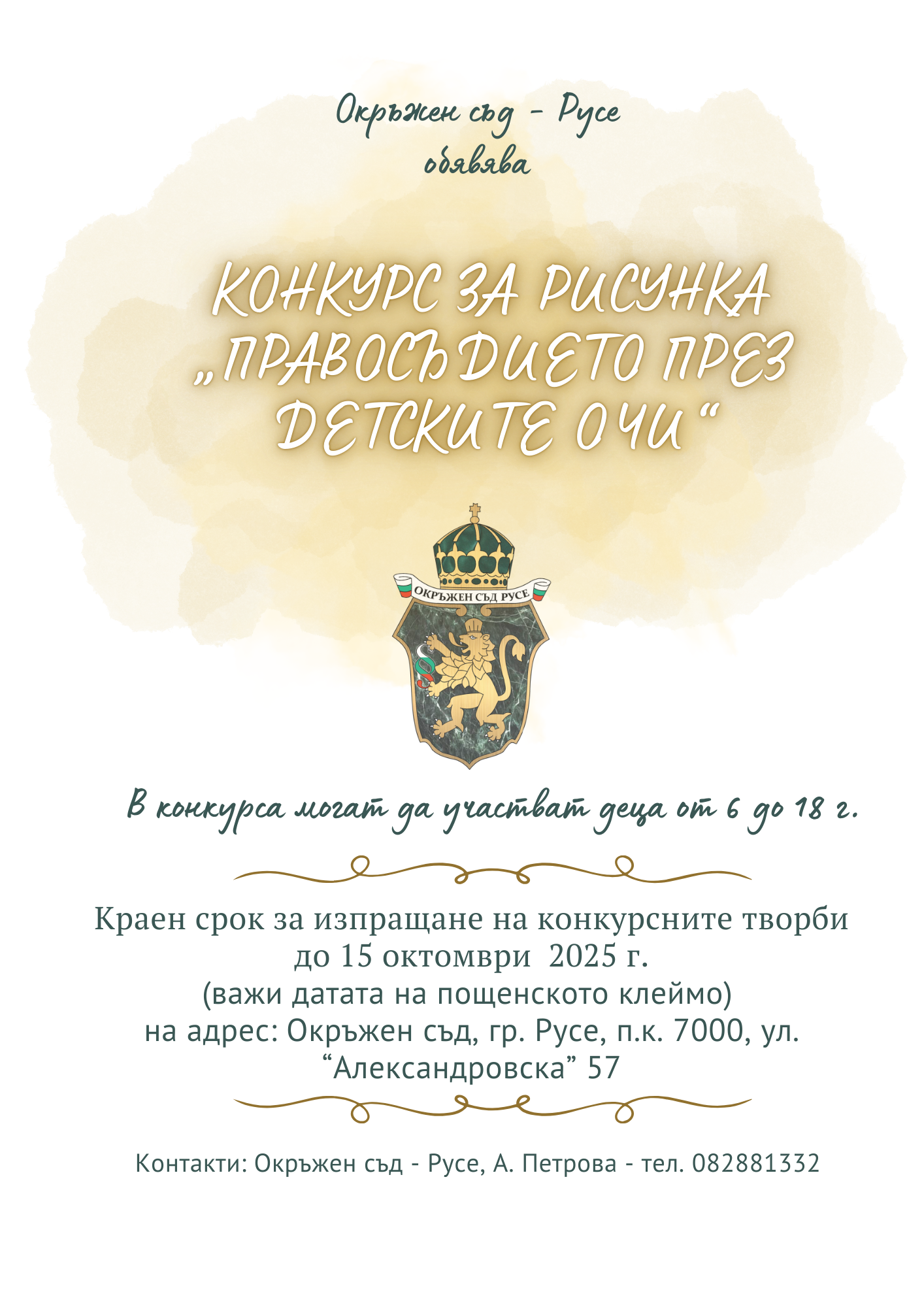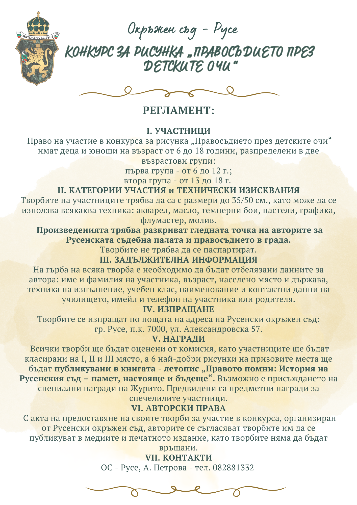 - Конкурс за рисунка „Правосъдието през детските очи“, организиран от Окръжен съд – Русе, регламент